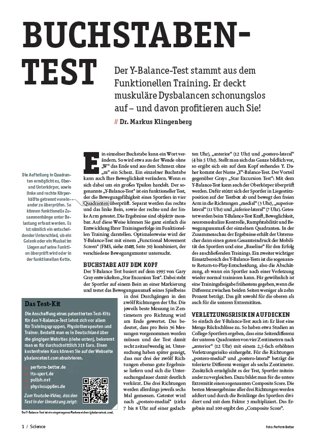 Ein einzelner Buchstabe kann ein Wort verändern. So wird etwa aus der Wende ohne „W“ das Ende und aus dem Schmerz ohne „m“ ein Scherz. Ein einzelner Buchstabe kann auch Ihre Beweglichkeit verändern. Wenn es sich dabei um ein großes Ypsilon handelt. Der sogenannte „Y-Balance-Test“ ist ein funktioneller Test, der die Bewegungsfähigkeit eines Sportlers in vier Quadranten überprüft.