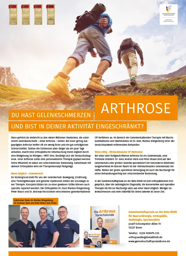Ich bin Facharzt für Orthopädie und leitender Arzt an der Beta Klinik in Bonn. Meine Spezialgebiete sind minimalinvasive Schulter-, Knie- und Sprunggelenk-OPs. In der Sportmedizin liegen meine Schwerpunkte im Bereich Verletzungs- Prophylaxe und Rehabilitation.