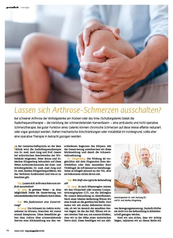 Bei schwerer Arthrose der Wirbelgelenke am Rücken oder des Knie-/Schultergelenks bietet die Radiofrequenztherapie – die Verödung der schmerzleitenden Nervenfasern – eine ambulante und nicht operative Schmerztherapie. Bei guter Funktion eines Gelenks können chronische Schmerzen auf diese Weise effektiv reduziert oder sogar gestoppt werden. Stehen mechanische Einschränkungen oder Instabilität im Vordergrund, sollte eher eine operative Therapie in Betracht gezogen werden.