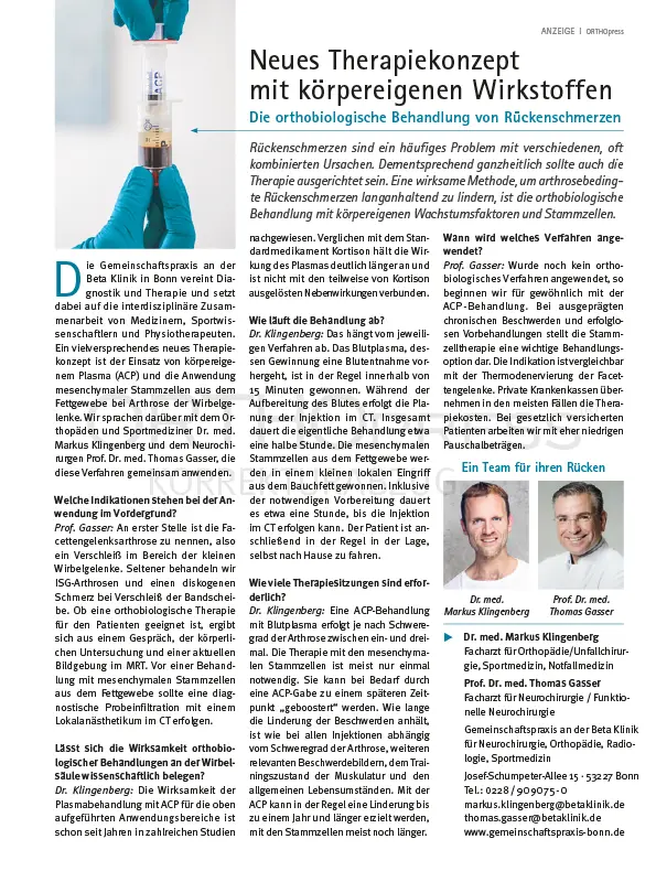 Rückenschmerzen sind ein häufiges Problem mit verschiedenen, oft kombinierten Ursachen. Dementsprechend ganzheitlich sollte auch die Therapie ausgerichtet sein. Eine wirksame Methode, um arthrosebedingte Rückenschmerzen langanhaltend zu lindern, ist die orthobiologische Behandlung mit körpereigenen Wachstumsfaktoren und Stammzellen.