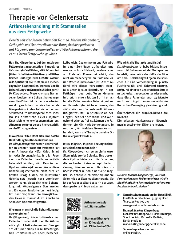 Bereits seit vier Jahren behandele ich Arthrosepatienten mit körpereigenen Stammzellen und Wachstumsfaktoren, die ich aus ihrem Fettgewebe gewinne.