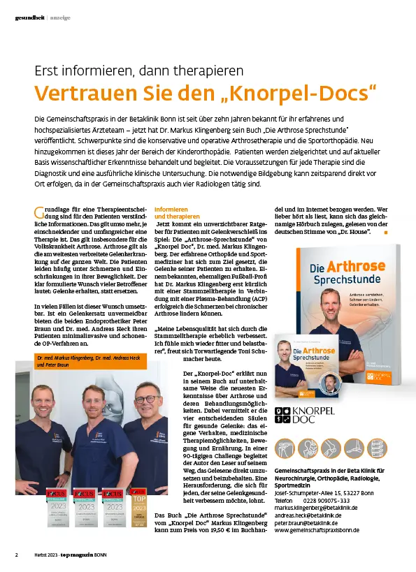 Die Gemeinschaftspraxis in der Betaklinik Bonn ist seit über zehn Jahren bekannt für ihr erfahrenes und hochspezialisiertes Ärzteteam – jetzt habe ich mein Buch „Die Arthrose Sprechstunde“ veröffentlicht.